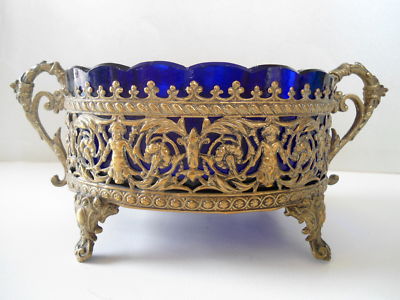 Title (ebay affiliate link): ANTIQUE VINTAGE ART NOUVEAU BRONZE COBALT BLUE GLASS HARDINIER BOWL