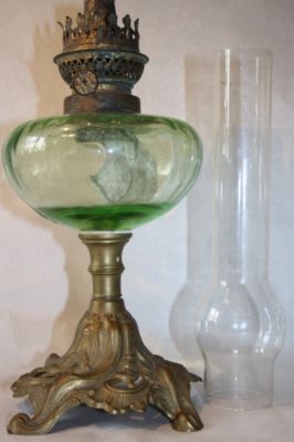 Lovely Antique Painted Green Glass Oil/Kerosene Lamp