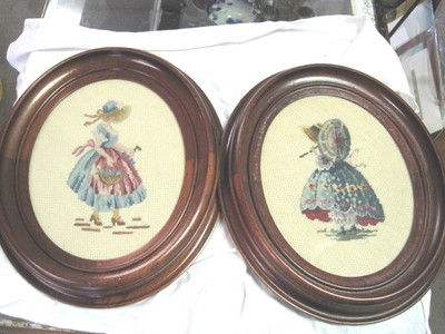 PAIR WALNUT OVAL DEEP DISH PICTURE FRAMES EMBROIDERY