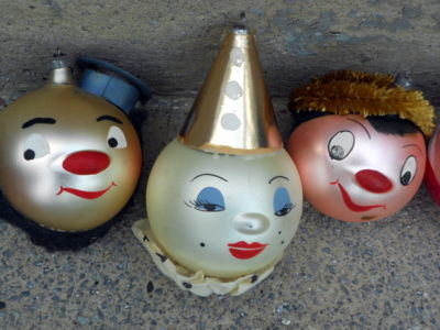 Title (ebay affiliate link): 7 VINTAGE hand painted GLASS CHRISTMAS ORNAMENTS faces Santa Claus clown woman