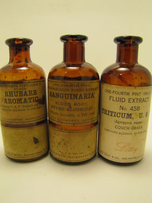 Title (ebay affiliate link): 3 ELI LILLY LABELED PHARMACY BOTTLES - RHUBARB AROMATIC - SANGUINARIA - TRITICUM