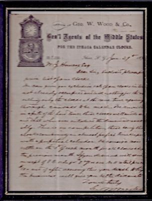 ITHACA CALENDAR CLOCK LETTER SELLING CLOCK FOR $7.50 IN 1875 / SIGNED GEO WOODS