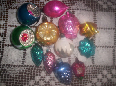 12 Vintage Christmas Ornaments-Basket,Indents,Mica,Star,Pinecone,Grapes,Strawber
