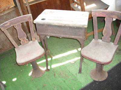 ANTIQUE SCHOOL DESK 2 CHAIRS WOOD IRON BASE BARN FINDS