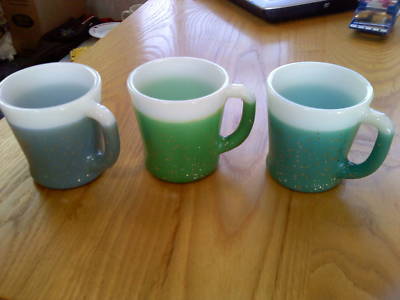 3 milk glass mugs w/ rubber/plastic coating Fire King ?