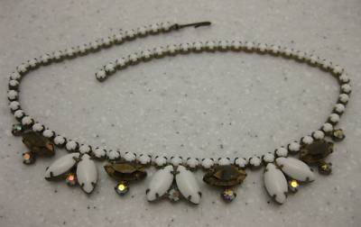 VINTAGE NECKLACE MILK GLASS, BRONZED & AB RHINESTONES