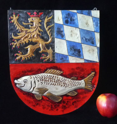 Title (ebay affiliate link): Antique Carved Wood COAT OF ARMS Lion wearing Crown + Fish Carp? MEDIEVAL