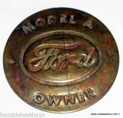 Title (ebay affiliate link): Vintage 1 3/4" brass = MODEL A FORD OWNER = Weld mark on the back.