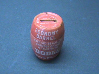 1930s Dodge barrel tin bank, Dodge economy gas barrel coin bank