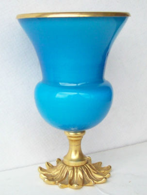 Title (ebay affiliate link): VTG OLDER PEACOCK BLUE & CASED WHITE GLASS BRONZE OR BRASS ORMOLU VASE URN
