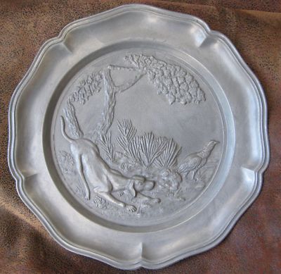 Vtg. German Pewter Plate Dog Hunting Pheasant