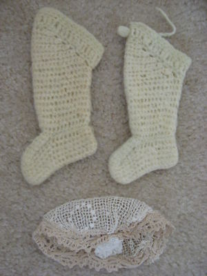 ANTIQUE DOLL BOOTIES AND BONNET.