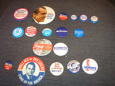 Title (ebay affiliate link): Lot of 17 Buttons: 1972 presidential election: Nixon/McGovern/Schmitz/Wallace/+