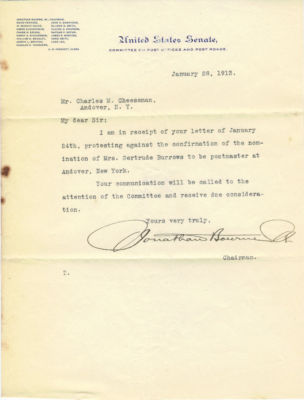 Title (ebay affiliate link): 1913 US Senate Johnathan Bourne Jr Charles Cheeseman Andover NY