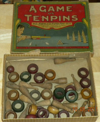 Title (ebay affiliate link): Vintage "A Game of Tenpins" child's game- American Toy Co. No 114 wooden pieces