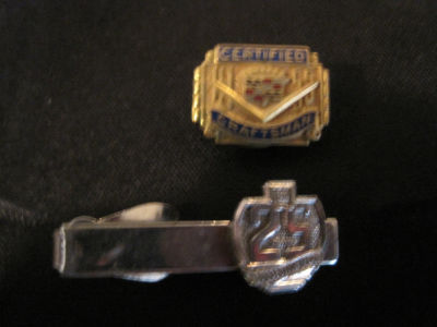 1955 cadillac certified craftsman pin & gm 25 yrs suggestion plan tie clasp