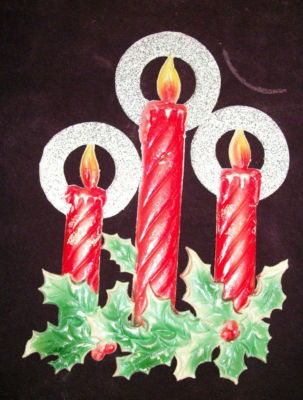 Title (ebay affiliate link): VINTAGE OLD GERMANY GLITTER CARDBOARD RED CANDLES & HOLLY WALL HANGING 9.5" X 7.