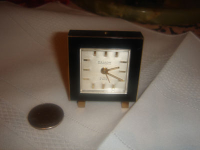 Title (ebay affiliate link): MINIATURE SWISS RELIDE ALARM 8 DAYS BLACK ENAMEL CLOCK
