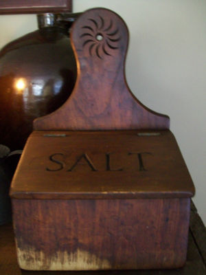 Title (ebay affiliate link): VINTAGE WOODEN NEW ENGLAND **SALT BOX** WITH WOODEN SALT SCOOP