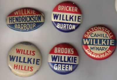 WILLKIE Coattail 1940 ILLINOIS, OHIO, INDIANA, MASSACHUSETTS, NEW JERSEY 5 pins