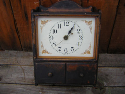 VINTAGE PRIMITIVE WOODEN GENERAL ELECTRIC KITCHEN CLOCK w/ APOTHECARY DRAWER