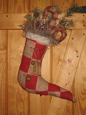 Title (ebay affiliate link): PRiMiTiVe OLDe CHRiSTMaS STOCKING ReD ViNTaGe QuiLT ToP CaNDy CaNeS DooR GReeTeR