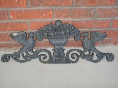 ANTIQUE CAST IRON STOVE TOPPER FIGURAL PLAQUE FLOWER BASKET BIRDS !NICE!