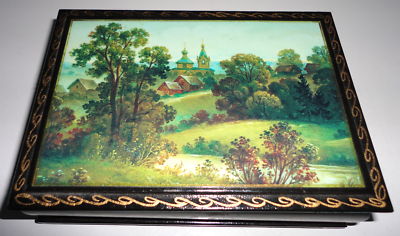 Title (ebay affiliate link): Gorgeous Antique Russian Hand Painted Wooden Lacquer Pastoral Scene Footed Box