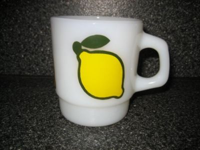 Title (ebay affiliate link): VINTAGE FIRE KING LEMON FRUIT MILK GLASS COFFEE CUP / MUG ~MINTY~