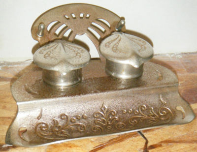 VERY OLD RARE ART DECO FANCY CHROME METAL DOUBLE INKWELL & MILK GLASS INSERTS!