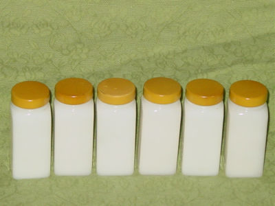 Title (ebay affiliate link): Set of 6 Vintage Milk Glass Bottles ~Jars ~ Spice Jars ~w/ metal lids ~ 3-1/2"