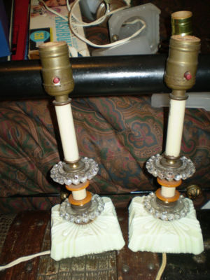 Title (ebay affiliate link): Pair of deco vanity lamps, candlewick styling, green milk glass base