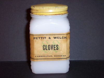 Title (ebay affiliate link): VINTAGE WHITE MILK GLASS CLOVES SPICE JAR MISSOURI LABEL