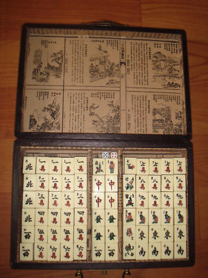 Fine Chinese MahJong Bamboo Bone Set & Leather Box