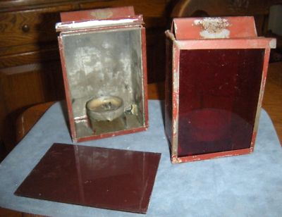 Title (ebay affiliate link): ANTIQUE PRIMITIVE TIN SHADOW BOX FRAMED RUBY GLASS CANDLE HOLDERS (2)