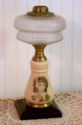 Title (ebay affiliate link): Antique Victorian Pedestal Oil lamp Font Reverse Paint Iron Base Frosted Font