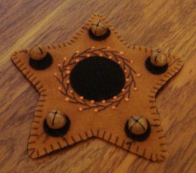 ~Primitive Wool Star Penny Rug~Votive Candle Mat~Rusty Bells~Pumpkin and Black