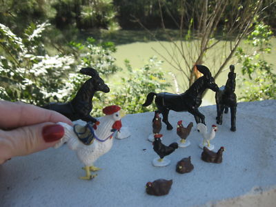VINTAGE. LEAD ~TOY FIGURES ~~CHICKENS ~HENS~3 HORSES~
