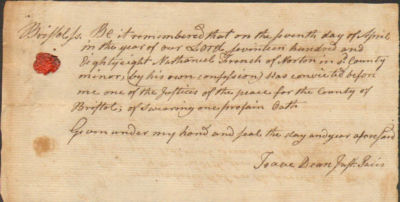 1788 EARLY AMERICAN DOCUMENT BLUE LAW FOR REVENUES (SWEARING ONE PROFANE QATH !)