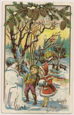 Title (ebay affiliate link): Children with SNOWMAN "A Happy New Year" embossed full color used 1908 postcard