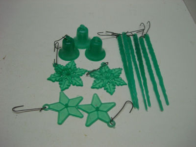 Title (ebay affiliate link): Vintage Lot Green Plastic Christmas Ornaments Icicles Bells Snowflakes Stars