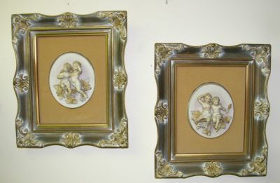 Title (ebay affiliate link): 2 Vintage Framed Porcelain CHERUB PUTTI Relief Victorian Guesso Wood