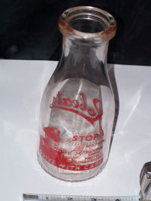 Title (ebay affiliate link): 7 1/4 Inch Roberts Clear Glass Milk Bottle With Red Lettering & Policeman's Pic.