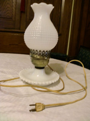 Title (ebay affiliate link): White Milk Glass Hobnail Candlewick Electric Lamp Globe and Saucer Style VTG