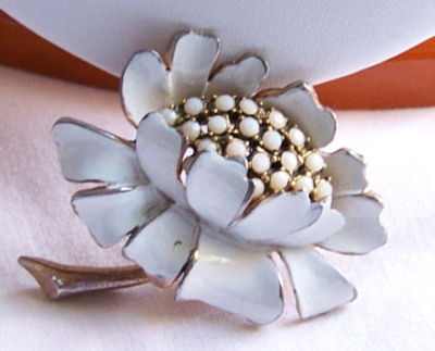 Title (ebay affiliate link): HAR RHINESTONE BROOCH WHITE FLOWER w/ HEAVY GOLD TONE BASE MILK GLASS STONES