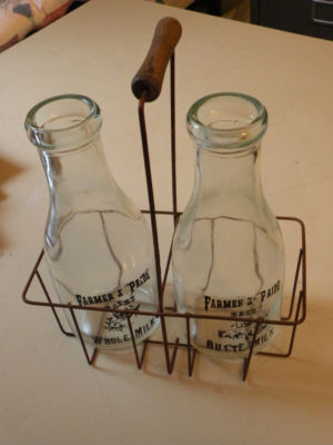 Title (ebay affiliate link): 2 quart glass milk bottles in wire carrier wood handle Farmer's Pride dairy