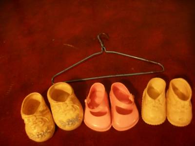 Title (ebay affiliate link): Antique doll shoes lot of 3 pairs 1 doll clothes hanger