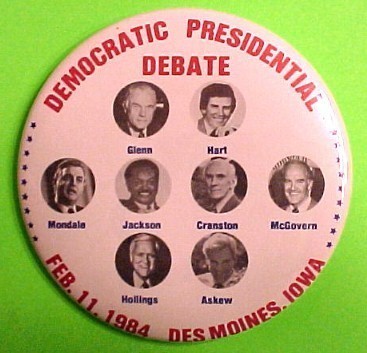 Title (ebay affiliate link): 1984 Democratic Presidential Debate Pin Des Moines Iowa