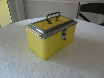 Title (ebay affiliate link): 1920s-1930s Yellow Ceramic cookie biscuit box jar with chrome cover Germany