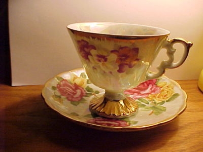 VINTAGE IRIDESCENT FOOTED FLORAL DECORATED CUP AND SAUCER